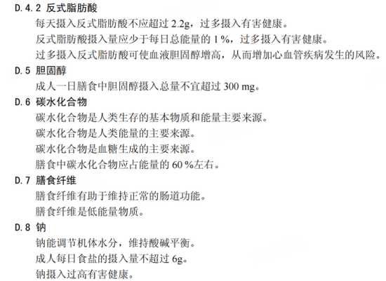 此外,在上述《食品安全国家标准—预包装食品营养标签通则》(GB 28050-2011)中,在“D.4.2 反式脂肪酸”一栏中还明确了反式脂肪酸对于人体的危害:“每天摄入反式脂肪酸不应超过 2.2g,过多摄入有害健康。反式脂肪酸摄入量应少于每日总能量的 1 %,过多摄入有害健康。过多摄入反式脂肪酸可使血液胆固醇增高,从而增加心血管疾病发生的风险”。上述国标中提及的反式脂肪酸包含了天然和工业加工各自产生的反式脂肪酸。