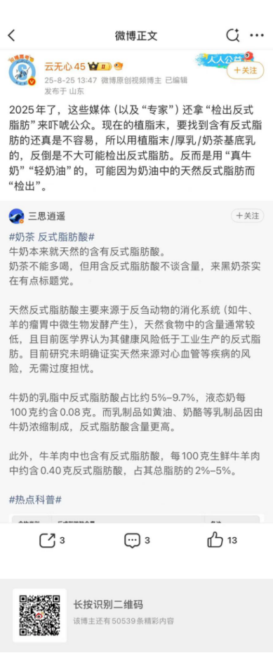 而在云无心微博个人主页上,其观点的原话为:现在的植脂末,要找到含有反式脂肪的还真是不容易,所以用植脂末/厚乳/奶茶基底乳的,反倒是不大可能检出反式脂肪。反而是用“真牛奶”“轻奶油”的,可能因为奶油中的天然反式脂肪而“检出”。