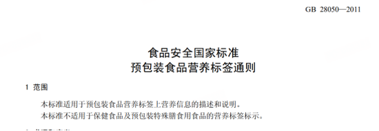 而更为重点的该标准的适用范围:“本标准适用于预包装食品营养标签上营养信息的描述和说明。本标准不适用于保健食品及预包装特殊膳食用食品的营养标签标示”。